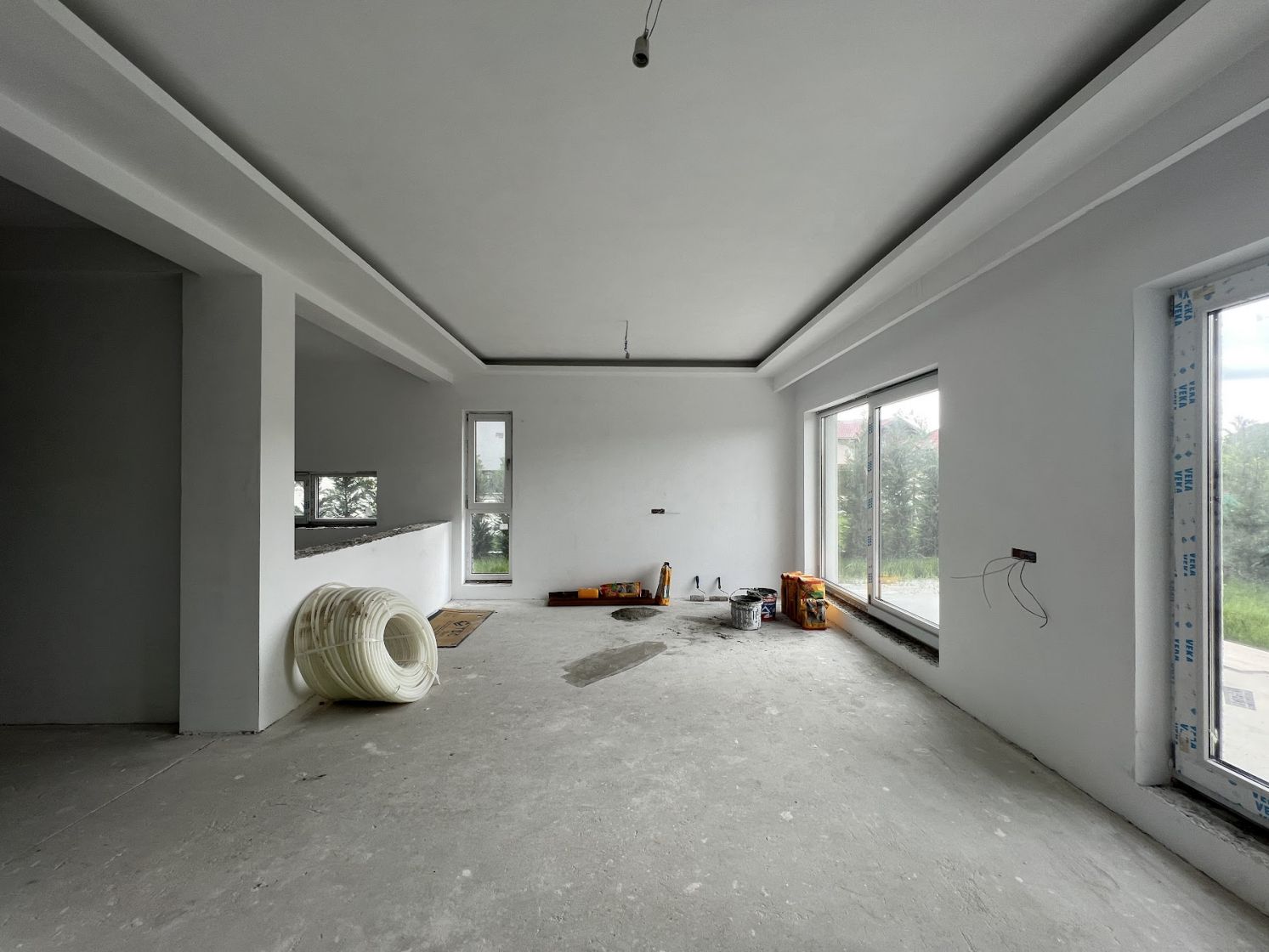 Parter: living, bucatarie semi-inchisa, camera tehnica, baie, birou/dormitor, acces pe terasa